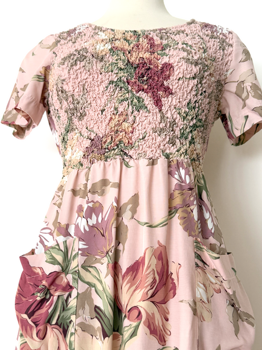 Vintage ~1990s Pink Floral Dress With Popcorn/Crinkle Bodice By Carol Anderson - Small
